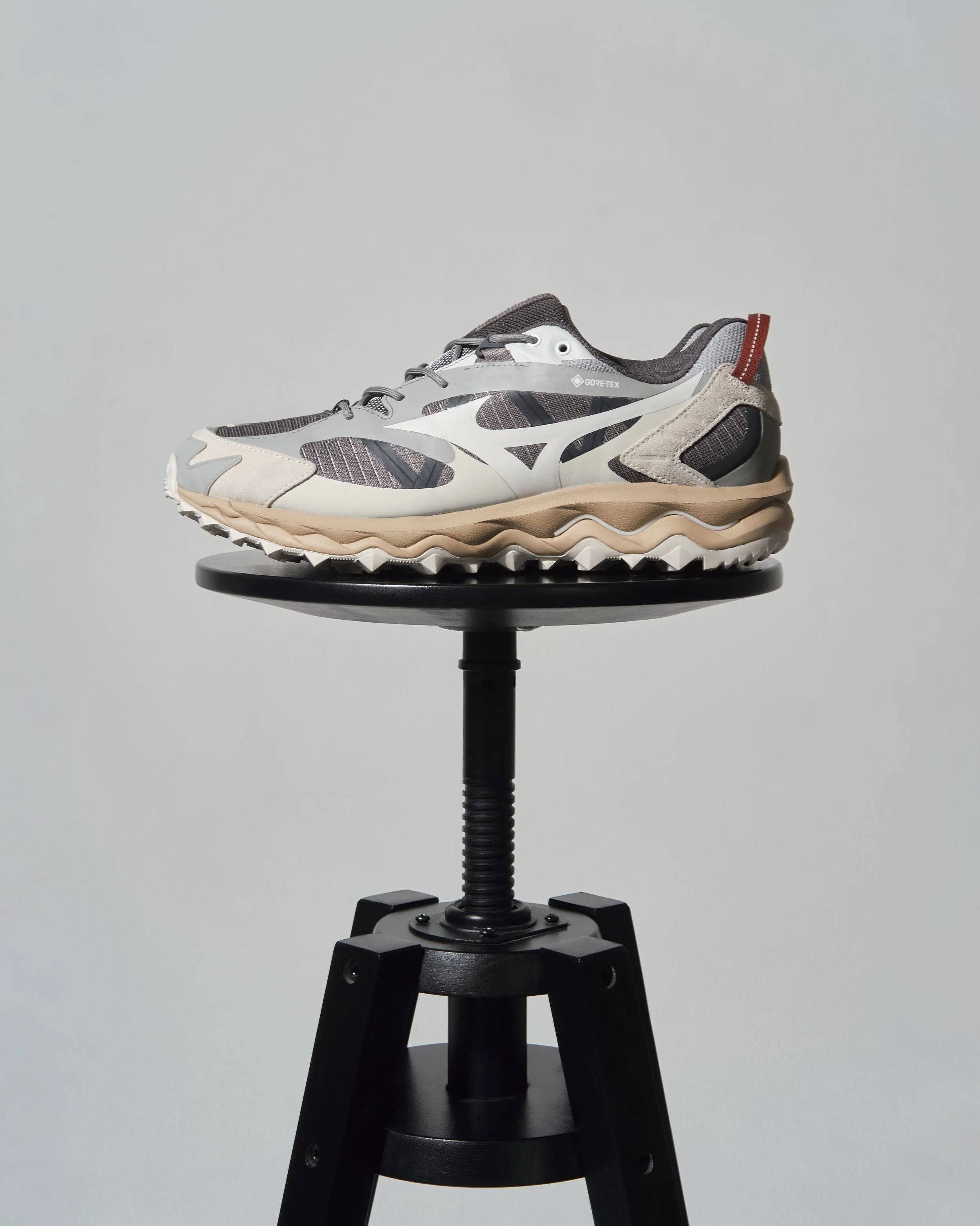 The Wave Mujin TL GTX keeps the same concept as the AW21 Wave Mujin TL, but shifting the leather execution with a technical thermo-transfer layering. This style represents an exciting combination of a running inspired upper and a high-technology performance sole from Mizuno top trail running range. It also brings a new exciting material collaboration with GoreTex, worldly recognized for its waterproof membranes. The upper is based on unreleased sketches of famed illustrator and designer Tuan Lee, rendered either in monochrome or in a very light camo print, and is paired with a trail sole in optical white. This Wave Mujin TL GTX has a distinct outdoor feel, while staying sleek and sophisticated. Combined with function-based pieces of apparel, it can become the perfect shoe to please the ones that want to bring outdoors and fashion together, keeping the explorer mindset.
