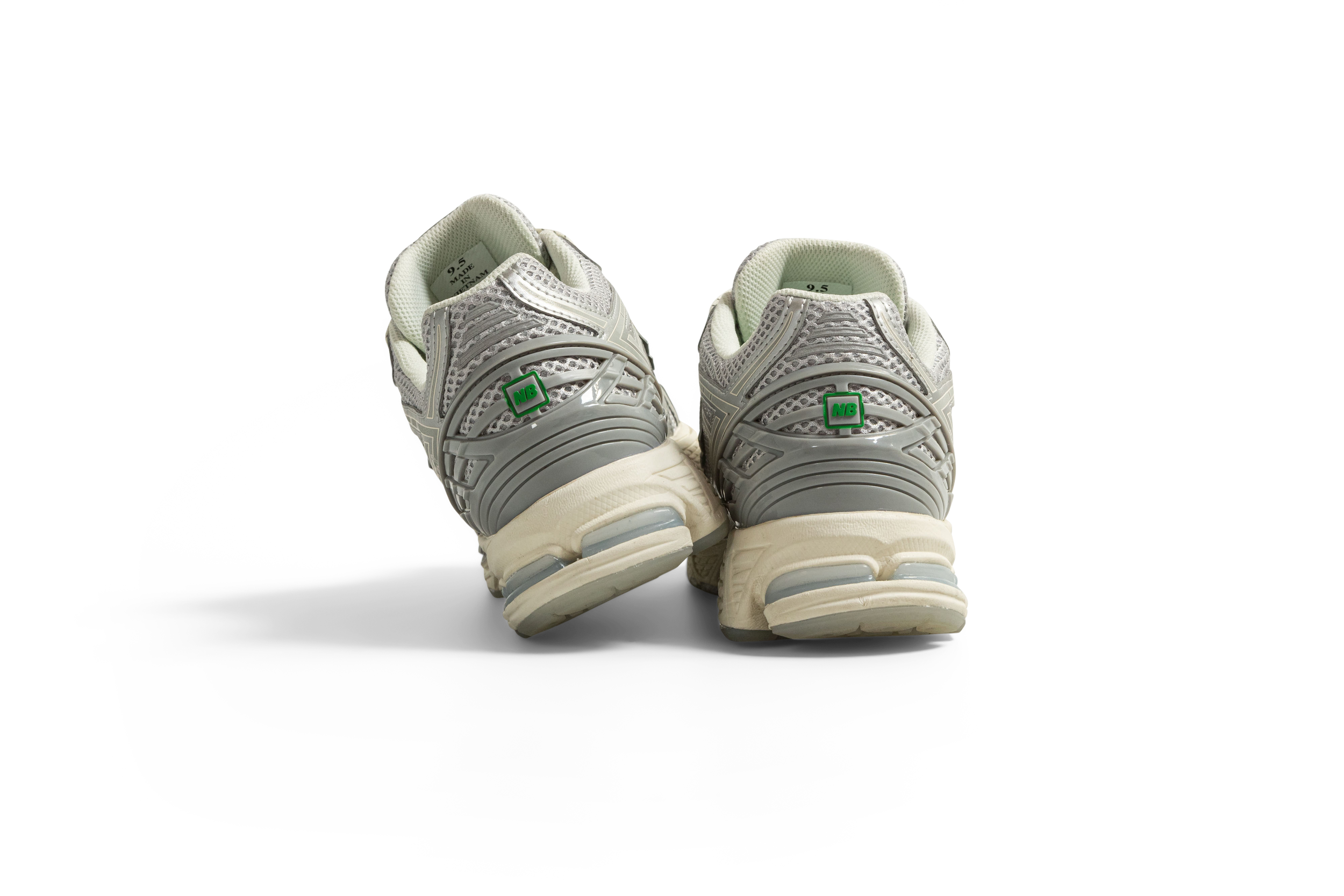 The colour palette is classic New Balance, executed in shades of grey. Instead of colour this version plays with light, drawing on differing forms of reflectivity. From the upper to the outsole, almost the entire shoe is monochrome save for a glimpse of green on the heel badge and sockliner.