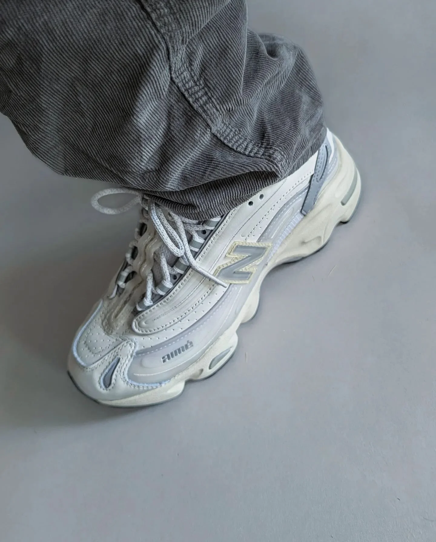 Materials: the base layer of this sneaker is a perforated white leather, & honestly, I didn’t even know it was leather until I saw them in hand lol, but it was a pleasant surprise. On the toe cap you’ll see more leather with a 3m hit on the lateral side & silver embroidery on the medial side. Behind the the toe is a TPU panel that has a smoky white effect with a AIME logo in silver. The N logo on this model is always something I’ve enjoyed bc it looks like a see through window w/ a silver inlay and a slight yellow tint on the borders. Below the lace cage, there’s more of that white leather with a silver embroidery that contrasts with the rest of the panels. I thought this was unique, but the insole have a mesh like texture to them that look similar to mesh shorts & idk why, but it reminds me of those gym videos from the 90s with the crazy loud jackets where you would probably see a model like this or some vintage NB on foot lol Lastly, for the branding, these were pretty heavily branded w/ an AIME logo on the tongue & insole, but there’s also some extra NB & NB1000 logos on the tongue, back heel, & insole as well. Overall, I was pretty impressed with this design.