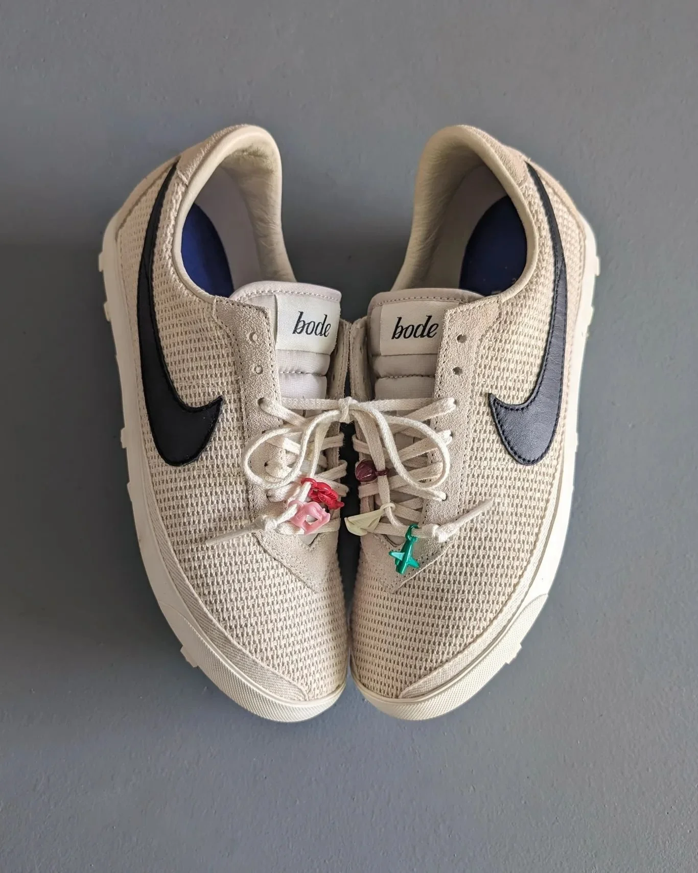 Materials: the upper of this pair is a woven cotton material in an Ecru cw, the woven pattern looks similar to the stussy spiridon. The weave acts as the mesh & has held up pretty well with very minimal creasing so far. On the toe cap there's some spacing that leads to a corduroy panel that wraps around both sides and ends near the back heel. Moving to the swoosh, they used a soft 🖤 leather that feels & looks pretty nice in hand. Next would be the back heel and lace cage, they went with a darker🍦suede that feels decent, but nothing too crazy. Regarding branding, Bode added some subtle branding on the tongue tag and on the insole. & Lastly, I wanted to mention the trinkets that they added. They're a pretty unique addition that pays homage to the Owner who would go antique shopping with her parents. They snuck in the Bode & Nike Swoosh logo on the trinkets depending which way you flip it. One of my trinkets has already broken off, so I'd honestly recommend taking them off. Overall, this is definitely my favorite cw in the pack & I really feel like the packaging, extras, & materials really create a special experience when you open these up.