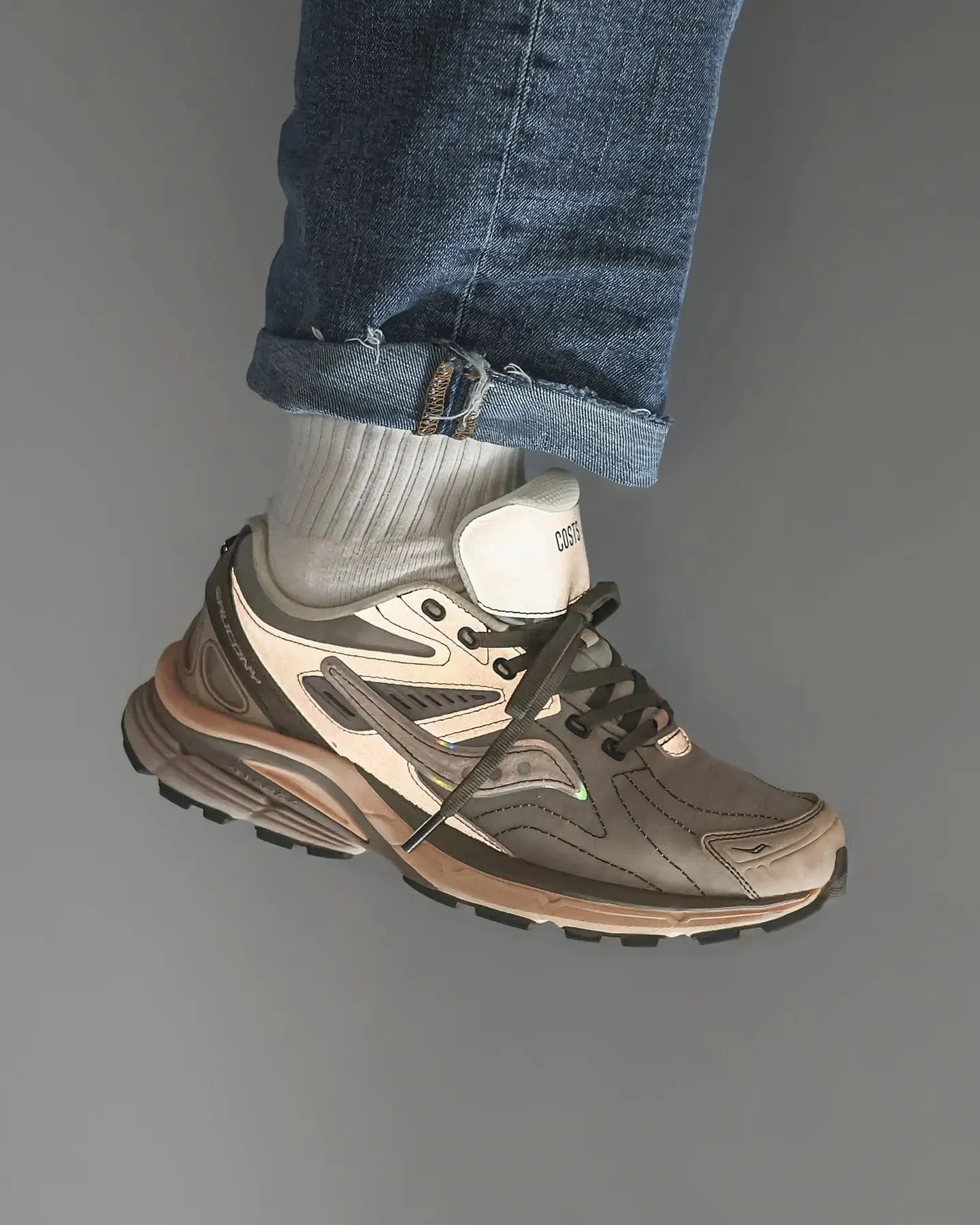 Materials: starting at the mudguard, there's a grey nubuck panel w/ COSTS branding on the ⬅️ pair & the S logo on the ➡️ pair. The base layer of the shoe feels like a fusion of ripstop & canvas material. I've never seen this used on an upper tbh lol, but it looks & feels really durable & breathable. What I really like about this upper is that it has a grey embroidery w/white dots that moves t/o the toe box & reminds me a lot of stars & the pattern folks use when mapping out the stars like the little dipper & so on. Continuing the space theme, on the 3 rivers logo has a iridescent/pearl-like panel that wraps around the logo. Following the logo is a 3m panel found on both sides & also on the tongue. Moving to the heel counter, there's a dark olive nubuck with Saucony branding followed by a 🖤 pull tab. Something I found really unique is the entire sneaker has a clay dust effect to it, as if you went to a baseball field & ran around (or Mars if you wanna stay on theme 🫣). Lastly, for branding, there's a costs logo on the ➡️ tongue & Saucony on the ⬅️ pair & the branding switches for the insoles. Overall, COSTS did an incredible job on these & honestly this entire pack was excellent.