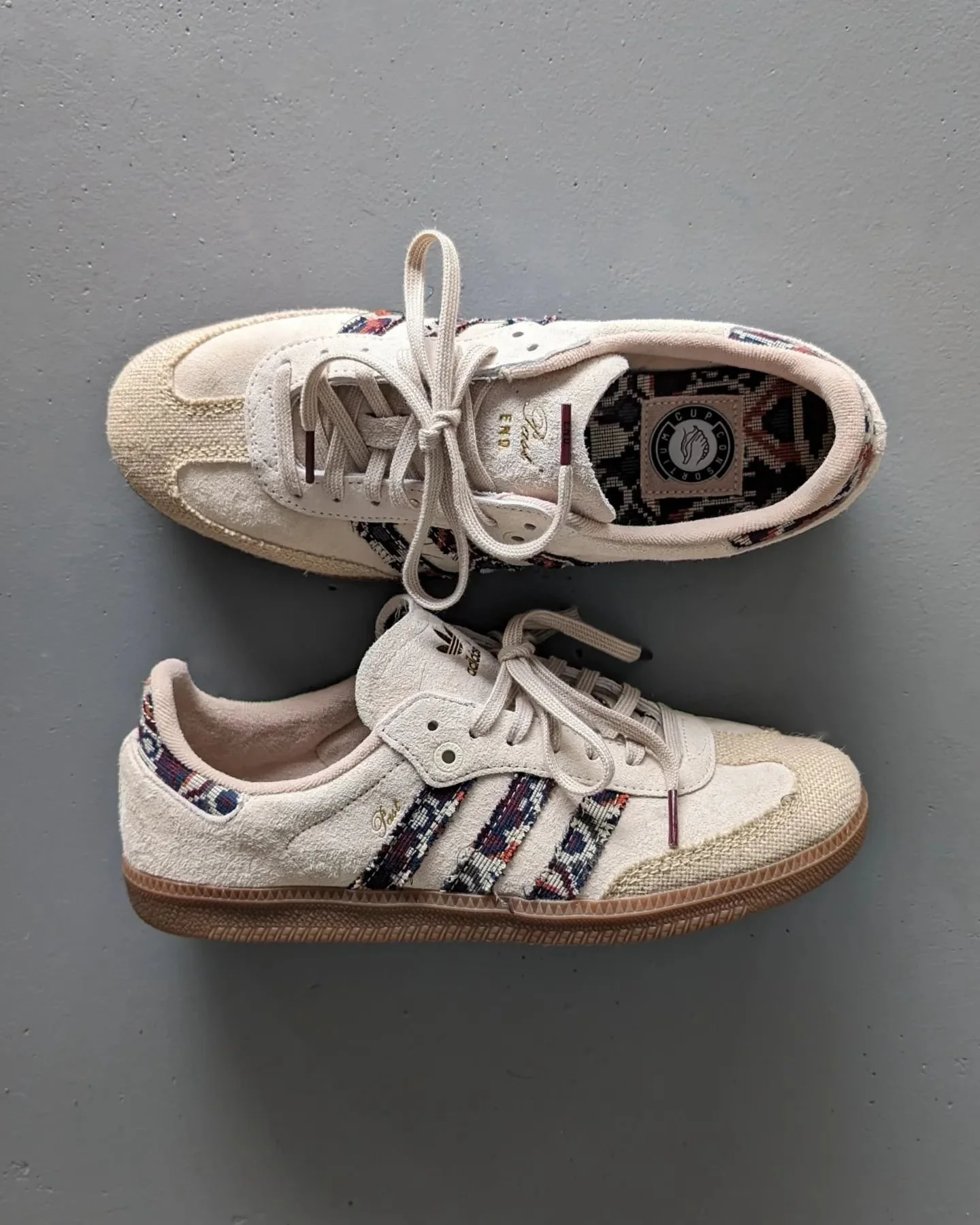 Materials: Starting at the toe cap, we have a hemp-like material in it's natural shade. Underneath the canvas is a very premium cream suede that is really soft to touch & has a nice color change when brushing across. If compared to another design, I would say the suede quality is similar to a Made NB in terms of softness. On the stripes they went with a canvas like material with a Persian rug pattern that has subtle frey to it. The canvas isn't soft like a rug, but is soft like a fabric. Behind the stripes, is the word "past" debossed in gold. My favorite feature of these is inside the 👟. They used the same rug pattern behind the entire tongue and on the insole. Lastly, they added some more branding on the tongue with "past" & "End" debossed in gold on the left shoe & the adidas trefoil logo on the right pair (they even snuck in the subtle "End" logo on the back heel). Overall, this was really well designed & I'm super grateful to have copped on release day.