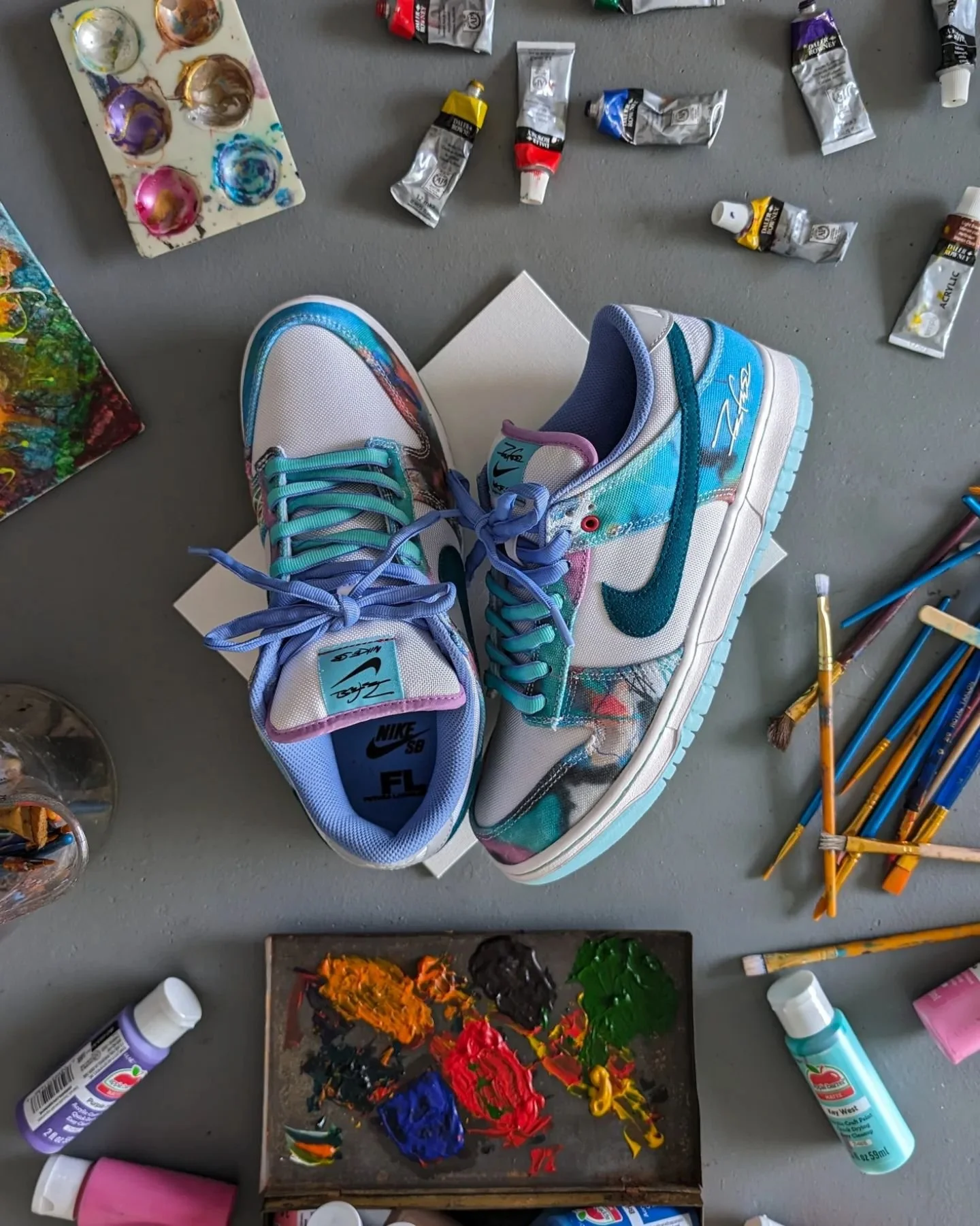 Materials: the base layer of this SB is a thick, white mesh that is similar to the mesh used on the infrared dunks back in 2020. The rest of the upper is a thick, aqua blue canvas with Futura's graffiti in multiple shades t/o it. The canvas & graffiti is Futura's nod to the iconic Paris dunk. On the back heel, you'll see Futura's Signature however, on the medial side is FL (Futura Laboratories) in white. The swoosh is a dark teal suede that feels okay to touch, but nothing crazy. On the medial side of the right shoe is a cream embroidered design. My favorite part is the laces, which are a two tone lace in teal & blue (the same shade of blue is also used on the sockliner). On the tongue, there's a purplish/pink border around the tongue w/ more futura & Nike SB branding on a teal tongue tab. Lastly, the insole has more of his signatures t/o it, as well as on the outsole hidden beneath an icy, see-thru blue outsole. Overall, there was a TON of details put into these, but the way the colors on the canvas work is beautiful.
