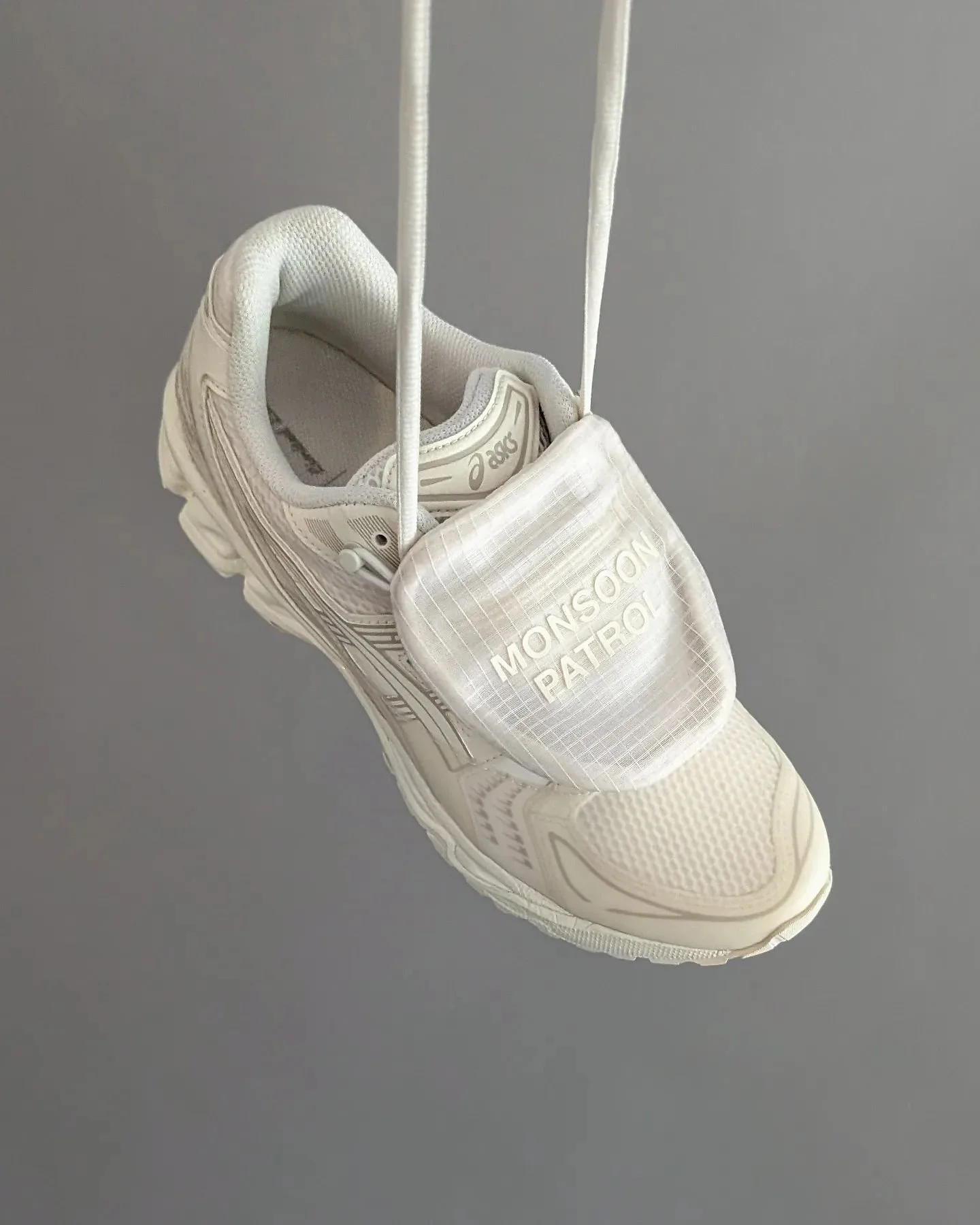 Materials: the base layer of this design is a white mesh, but on the toe, it has a clear/foggy silicon cover that wraps around the bottom half of the sneaker. The cover feels nice on foot & still allows you to have good movement and flexibility. Moving to the stripes, they used a synthetic leather in a cream/white color. The stripes grey inlays to add a nice contrast to the color blocking. From the midfoot to the back heel, there's a clear rip stop material that covers the base layer of mesh. Also, I like that they added a Matte Metallic print that gives some of specs of the shoes, i.e. MONSOON PATROL, GEL KAYANO 14, & SILICONE COVER. As for the tongue, you have the option to remove the pouch by unclipping & removing the cover if need be. The cover is waterproof & has a zipper on the back if you need to throw some supplies in them. Overall, this was a pretty awesome design & I'm really glad i picked these up. They have a nice gorp-core feel, while also continuing to remain functional given certain weather conditions... like a monsoon 🫣.