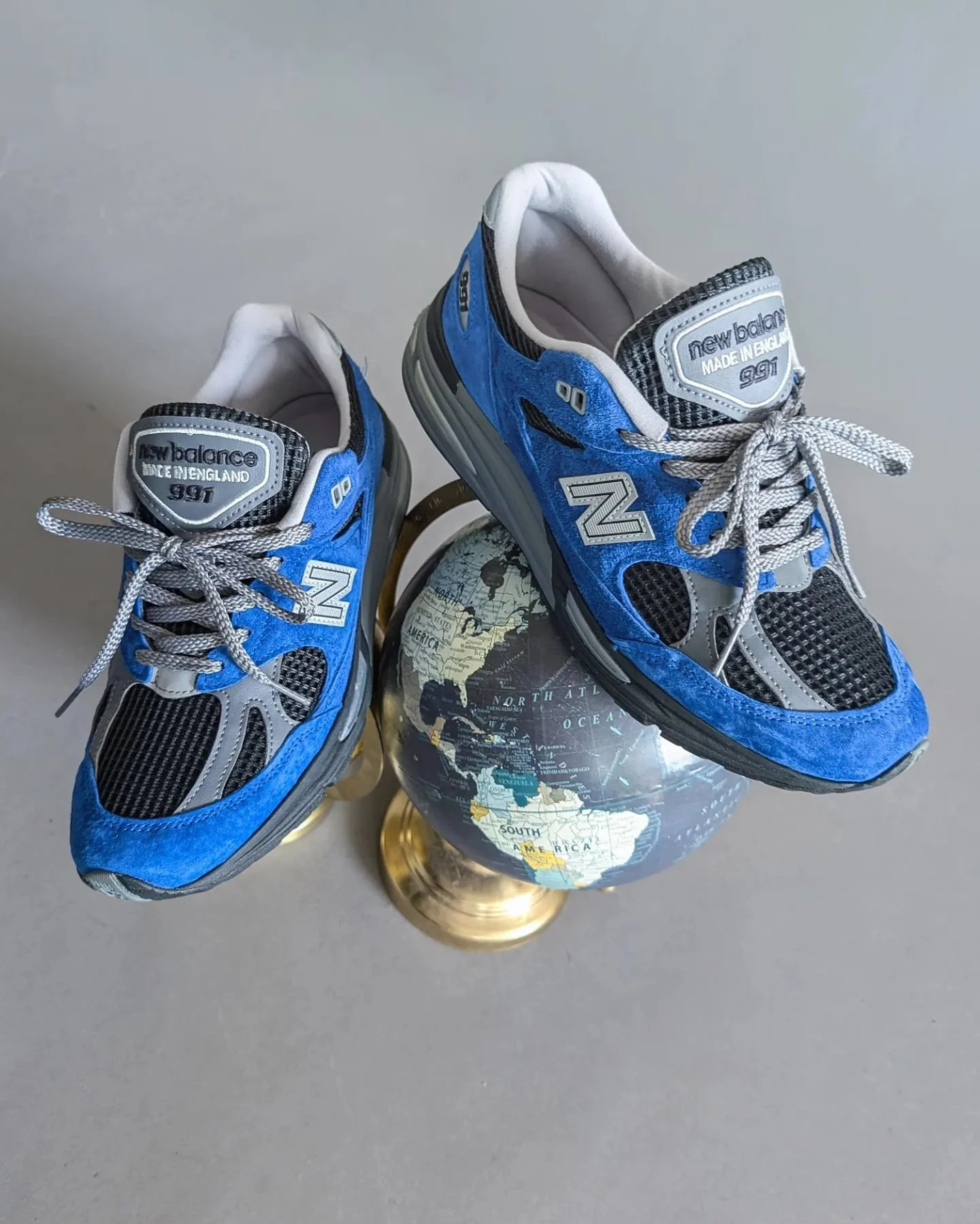 Materials: the base layer of this design is a š¤, big hole mesh in a square pattern for added breathability. This mesh carries throughout the upper & continues onto the tongue where there's a grey NB patch w/ Made in England, 991 embroidered into it. As for the suede used, it's beautiful in hand. It's a deep blue color that feels soft to touch and has a nice color change when brushing across it. For 3m hits, you'll find those on the N logo on the sides, the 991 branded bubble near the heel, on the back heel, & lastly at the bottom of the lace cage. Lastly, on the back heel, there's a V2 triangle patch embroidered into a grey panel. Overall, this is truly a beautiful pair of shoes & given the comfort of the upgraded 991, this is going to be an amazing pack & something you can wear for extended periods as well.