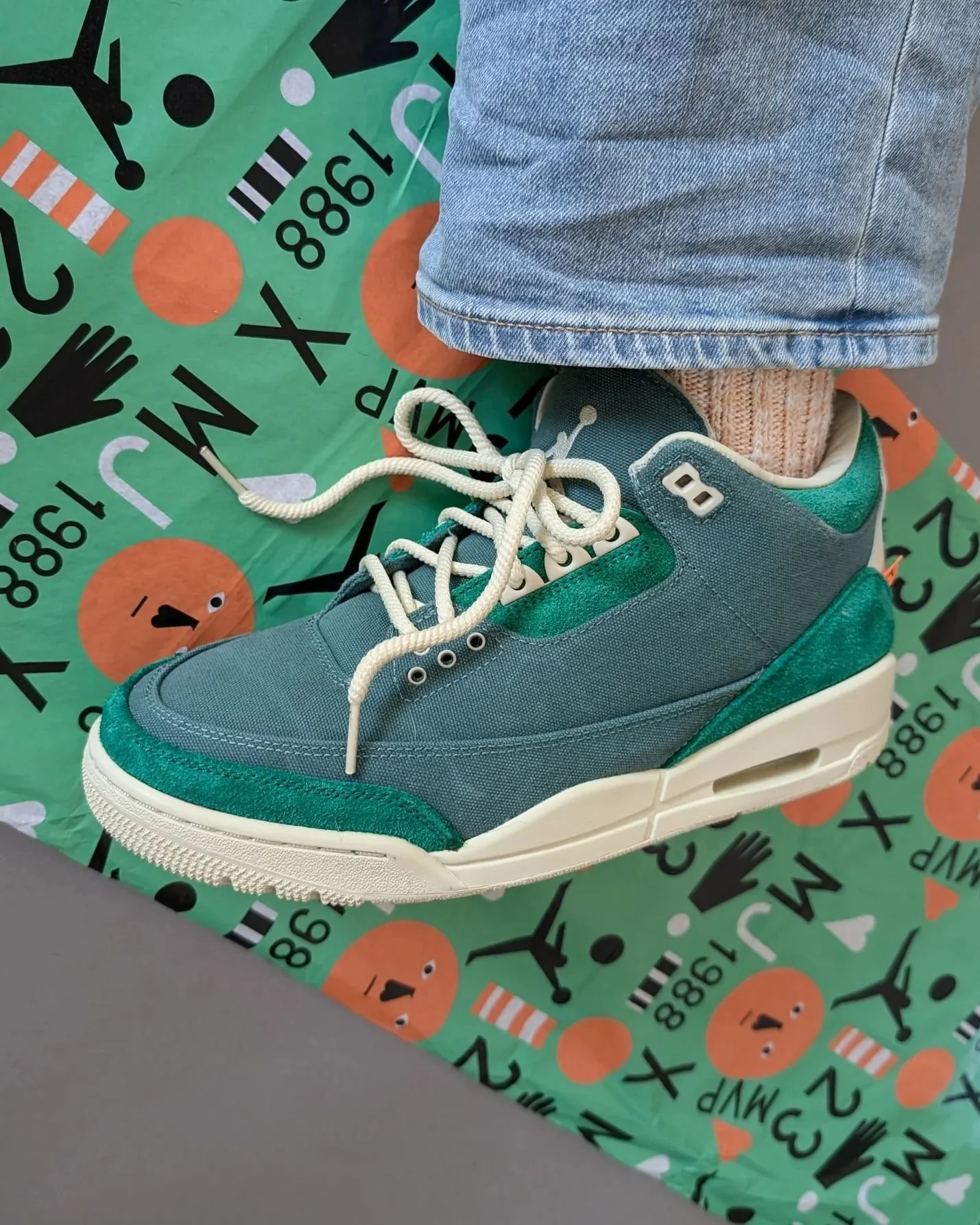 Materials: the base layer of this sneaker is a slightly faded, emerald canvas. I feel like the more this is worn, the more it will fade & continue to become lighter. My creasing has been very minimal but there is a slight fade in certain areas from wear. On the top cap she used a brighter 💚 & this suede can also be found on the back heel, on parts of the lace cage, & near the outside of the ankle collar. The suede feels nice in hand & has a bit of a fuzzy effect. The back heel is honestly the best part & truly sets off this whole design. The back heel is a 🍦 leather that is completely stitched into the heel. The Nike Air logo is a green chenelle material & then on the edge, there's a Jumpman tab in orange that can also be removed. On the tongue, there's Nina's personal take on the Jumpman logo embroidered in cream, this pays homage to some of her art. On the inside of the tongue is a leather lining with an orange patch saying 'Nina' on the right & 'Air Jordan' on the left. This cream leather continues around the ankle collar & at the insole, you'll see a checkered pattern with a Jumpman logo at the heel. Overall, there's so much potential to make these your own aesthetic, while also allowing Nina's art to shine on its own w/ her hidden details t/o the design.
