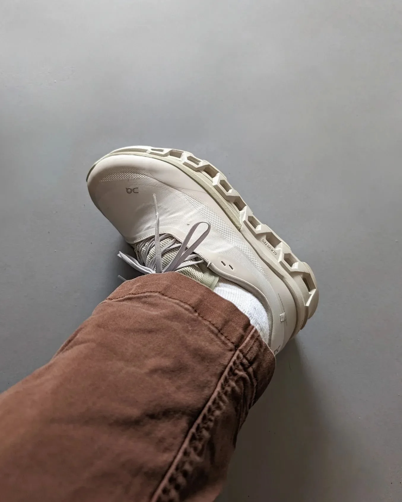 Materials: the upper of this sneaker is pretty nuts, so bare w/ me while writing this. Starting at the toe cap, there's a tough rubber cap in a moon-dust shade that wraps around the entire sneaker & creates a smooth S wave on the medial side of the toe cap that finishes off at the top of the lace cage. The toe box has a soft, but durable nylon cover that rests above the chalk colored mesh & acts like a 2nd layer. On the medial side of these & also on the tongue, you'll see more exposure of the mesh, but it's made w/ 2 different patterns, one is a lined pattern & the other looks like a 🏈. The mesh used is very breathable on foot & due to the materials & outsole, this sneaker is extremely light in hand. Lastly, the branding... There are scattered 3M 'ON' logos on the back heel & toe. Also on the back heel is their signature swiss cross with swiss engineering underneath. && Finishing off the branding with the PAF logo on the left insole & ON Cloudmonster on the right. Overall, this is a pretty crazy design & PAF nailed it.