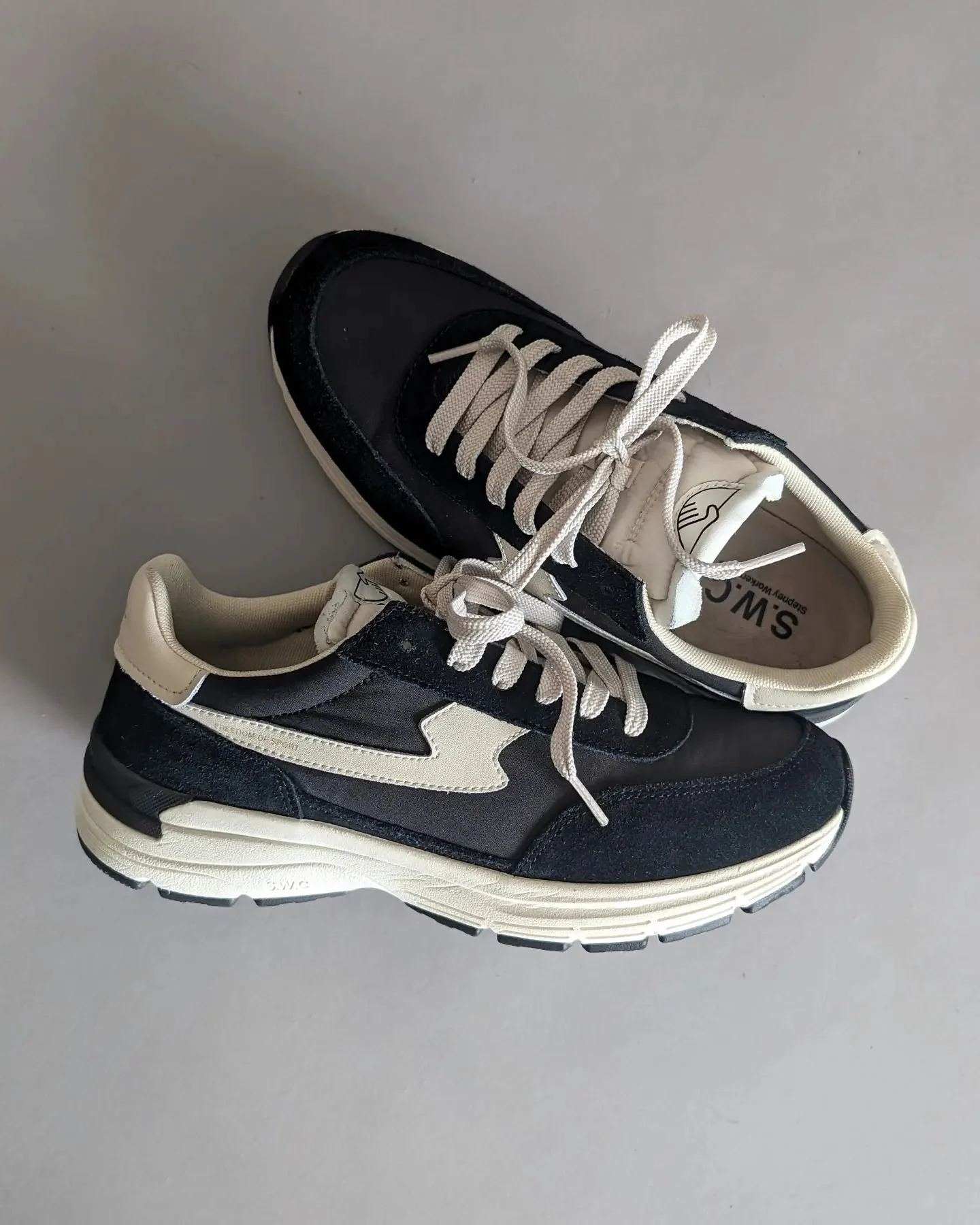 Materials: the uppers on these have a solid mix of a black nylon base w/ some leather & suede paneling t/o it. Starting at the toe cap, they went with a soft, black suede that feels pretty premium to touch. The suede wraps around the entire bottom half of the sneaker, but it splits into three panels on each side & also on the eyelets. Next up is the nylon, which feels a lot better than what you would imagine when you think of a nylon upper. It feels more sturdy & has had very minimal creasing at the time that I wrote this review. Next up, the leather hits... On the mid foot, there's an S logo in a cream-ish white w/ gold lettering that says 'Freedom of Sport'. You'll find more of the leather on the back heel with the SWC branding in gold. Lastly, on the tongue, it has an exposed foam on the edges w/ a tag that overlaps that shows their signature hand-shake logo 🤝. Overall, SWC really surpassed my expectations on these & the quality of materials they used were great given the price point.