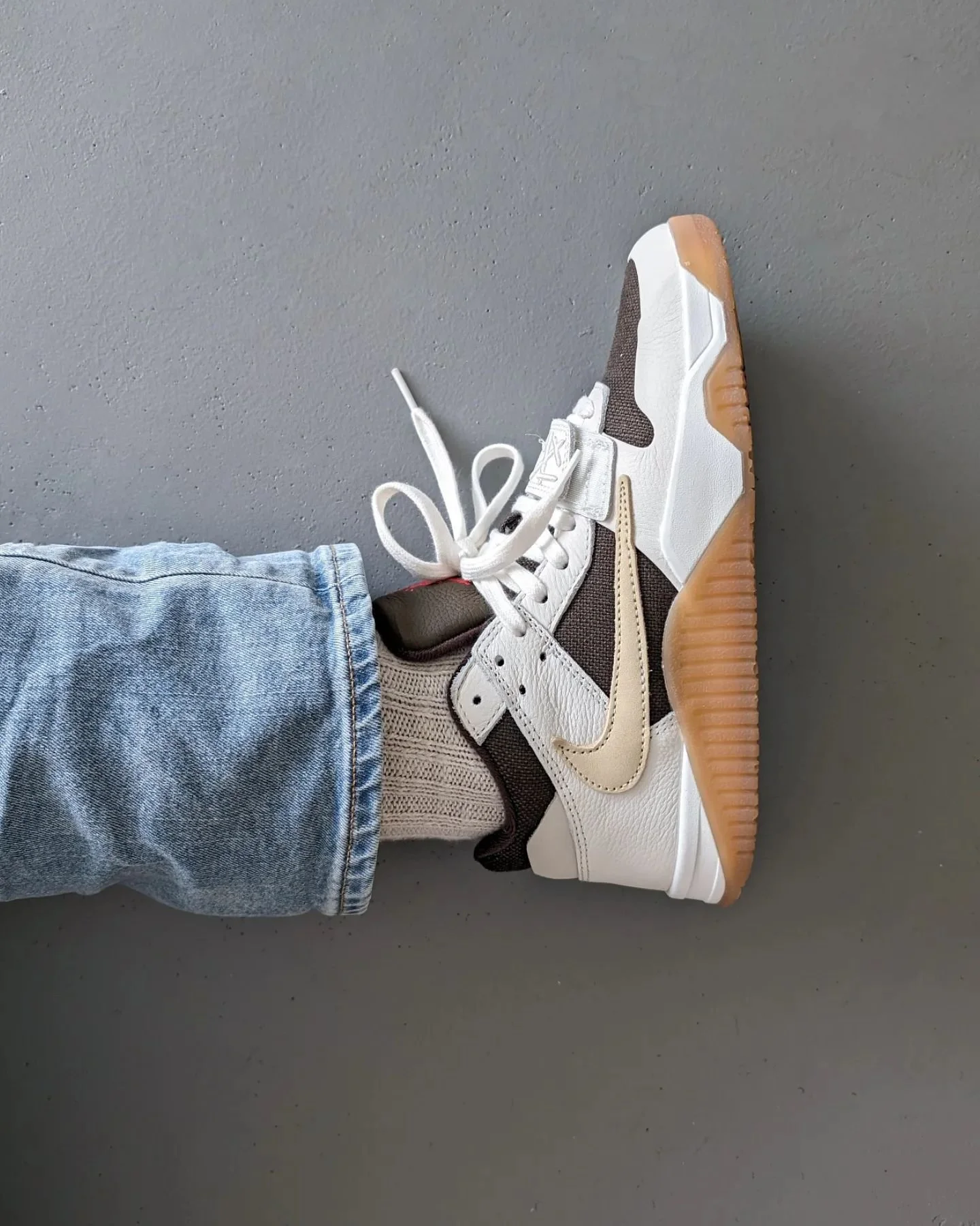 Materials: starting at the toe, they used a soft white leather that feels really nice in hand & has a bit of a tumbling effect too. Next up is the canvas, which is done in a π€ shade & has a nice durable feel on foot. I like the quality of the canvas bc it doesn't crease bad like the cheap stuff & imo, will age nicely & gradually fade w/ more wear, similar to Carhartt jackets (which was Travis' entire concept with this design, wear it). Next up, the reverse swoosh, which is a cream nubuck. Moving to the strap, you see more of that white leather where they embroidered a logo on top, which looks like a combo of the CJ 't'. On the tongue, they went with a soft, brown, tumbled leather with the Jumpman logo & CJ dashes embroidered in red. On the back heel there's more Travis branding with his signature embroidered face in red. Lastly, my favorite part, on the outsole, it looks like broken glass, but has jack printed on the bottoms that will fade away w/ more wear. Overall, I really feel like Travis & his team executed these perfectly.